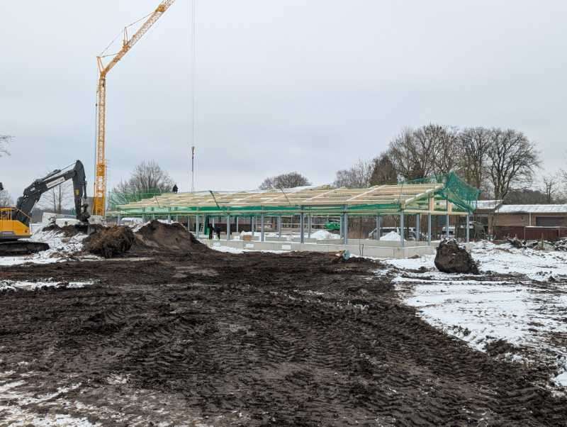 Zumindest die Halle hat jetzt ein Dach bekommen, mit Netz und ohne doppelten Boden